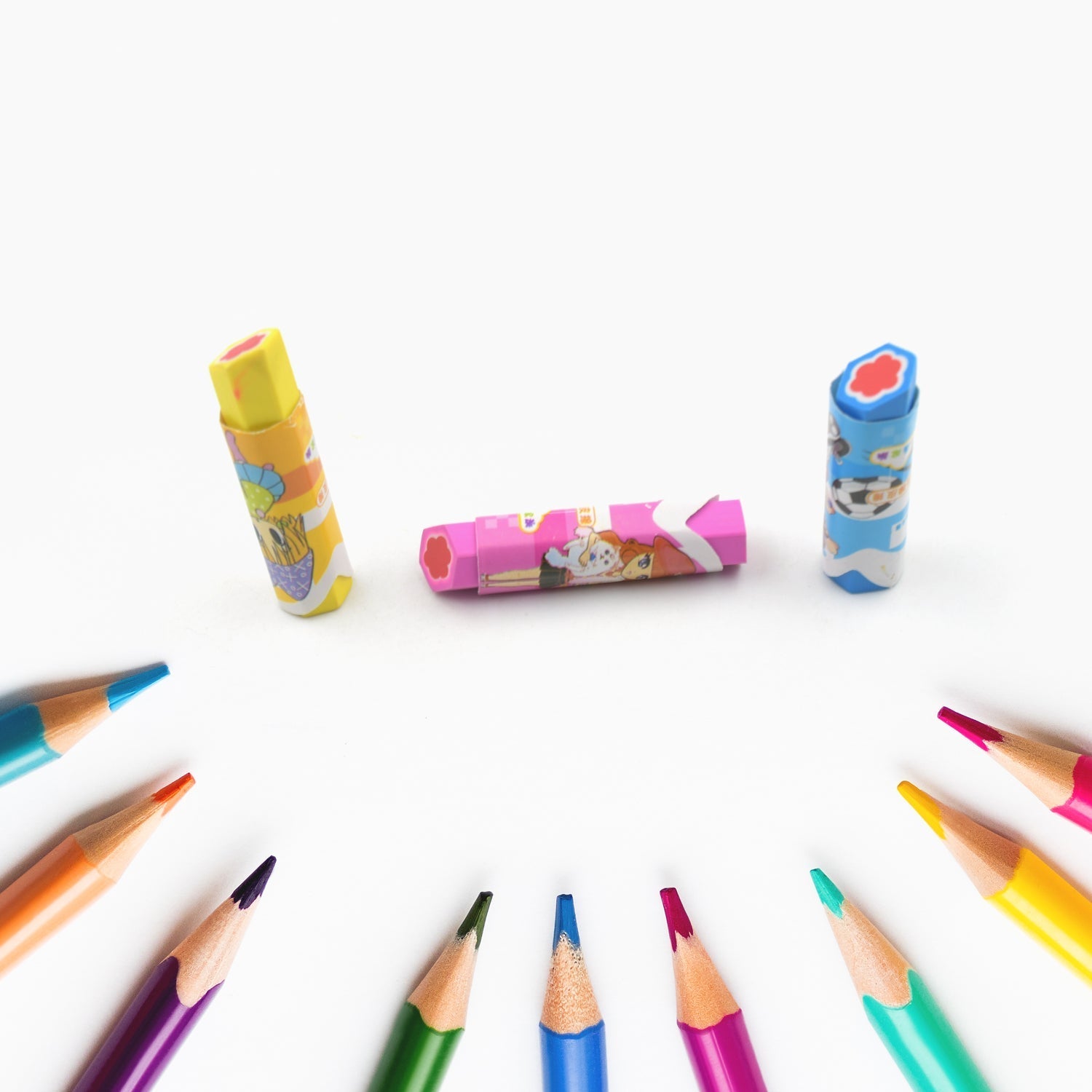 • Attractive colourful Lipstick shape, Cars, Thomas Train, Unicorn, Stacking Pen Shape, Teddy Bear, Mickey and Frozen Erasers.